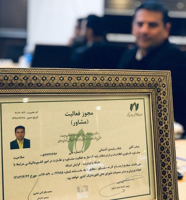 دریافت اولین گواهی‌نامه مشاوره پایه ۲ سازمان نصر توسط مدیرعامل شرکت تیام‌شبکه