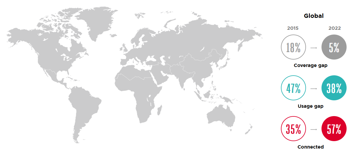 اتحادیهی GSMA در گزارش جدیدی که به سال ۲۰۲۳ ارتباط دارد، میگوید هماکنون ۵۵ درصد از جمعیت جهان معادل حدوداً ۴٫۳ میلیارد نفر گوشی هوشمند دارند. تعداد کاربران موبایلی اینترنت به ۴٫۶ میلیارد نفر میرسد؛ چهار میلیارد نفر از آنها ازطریق گوشی هوشمند به اینترنت متصل میشوند. مطابقبا آمار GSMA، در بین ناحیههای مختلف دنیا و دسترسی ساکنان آن مناطق به اینترنت نابرابری واضحی دیده میشود. ۶۹ درصد از دارندگان گوشی هوشمند در آمریکای شمالی، آسیای شرقی و اقیانوسیه مشغول استفاده از موبایل 4G هستند، اما اکثر کاربران در آفریقای جنوب صحرا (موسومبه آفریقای سیاه) همچنان از اتصال 3G استفاده میکنند. بهطور مشابه، یکسوم از کاربران در خاورمیانه و شمال آفریقا مشغول استفاده از اینترنت 3G هستند. رشد تعداد کاربران اینترنت موبایلی تعجببرانگیز نیست، با اینحال تقریبا ۳٫۴ میلیارد نفر در سراسر دنیا همچنان به اینترنت دسترسی ندارند. بر اساس گفتهی GSMA، بالغبر ۳۸ درصد از انسانها در نواحی تحت پوشش شبکهی پهنباند موبایل حضور دارند اما از آن استفاده نمیکنند. شکاف بین افراد آنلاین و افراد غیرآنلاین در آفریقای جنوب صحرا و جنوب آسیا بسیار بیشتر به چشم میآید. در این دو ناحیه بهترتیب ۵۹ درصد و ۵۲ درصد از جمعیت، به اینترنت متصل نمیشوند.